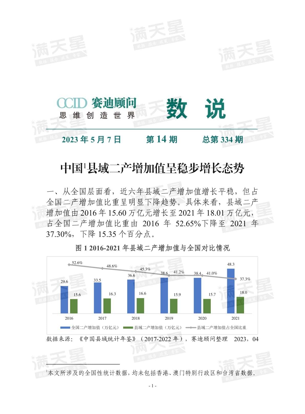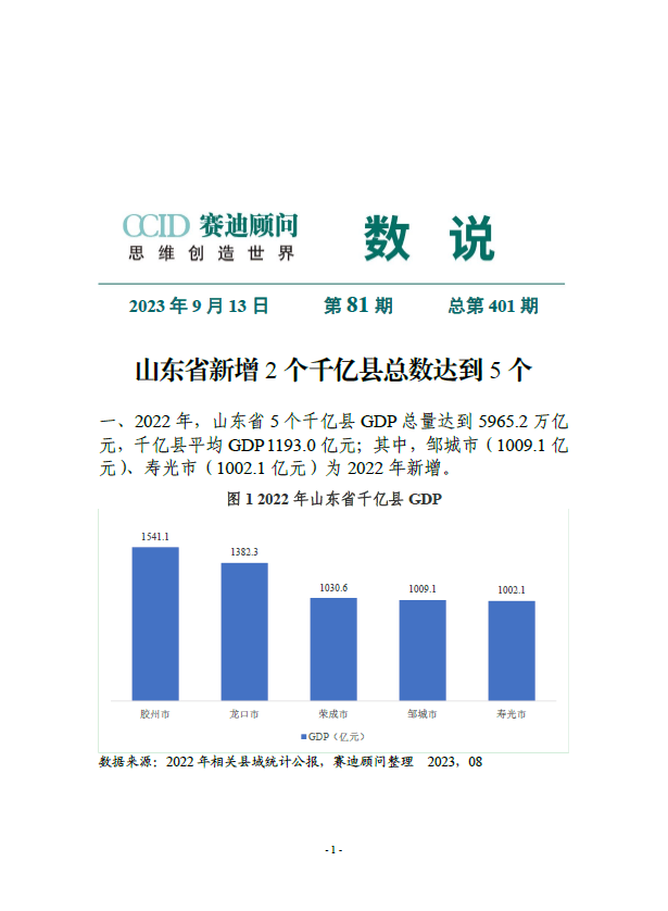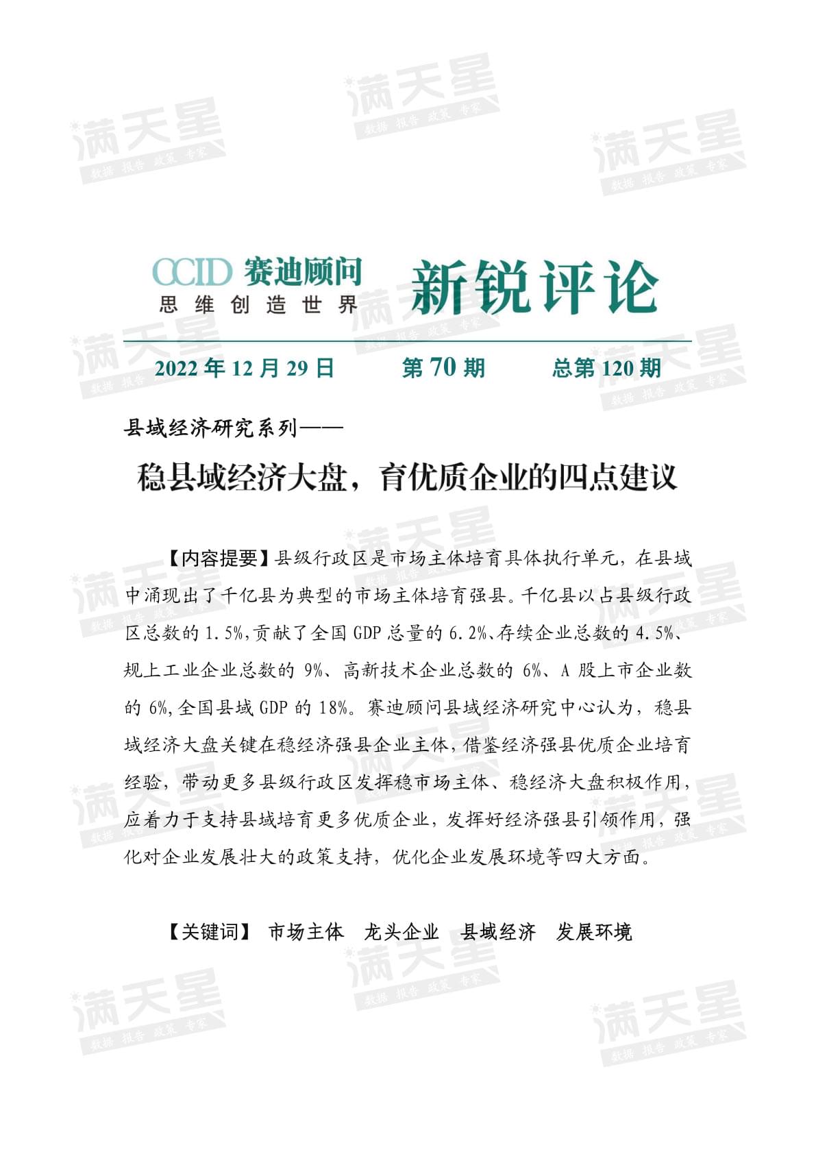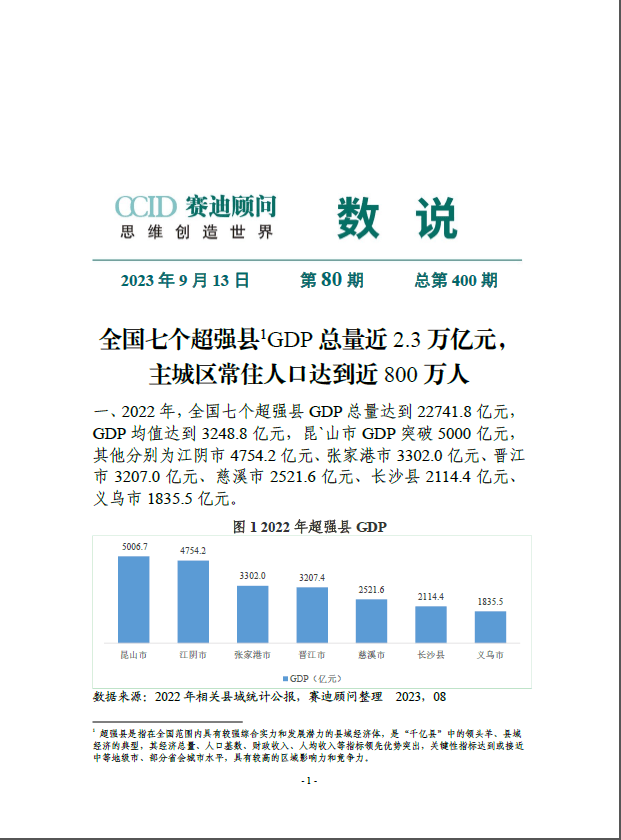 该报告共分六大章节,重点关注千亿县、工业大县和百 强县发展特点和模式,通过“事”说、“数”说、“道”说展 示县域发展图景,并有针对性的选取国内外县域经济发展实 践案例总结经验模式,同时针对县域新型工业化、新型城镇 化、城乡融合等重点课题提出五大发展方略建议。