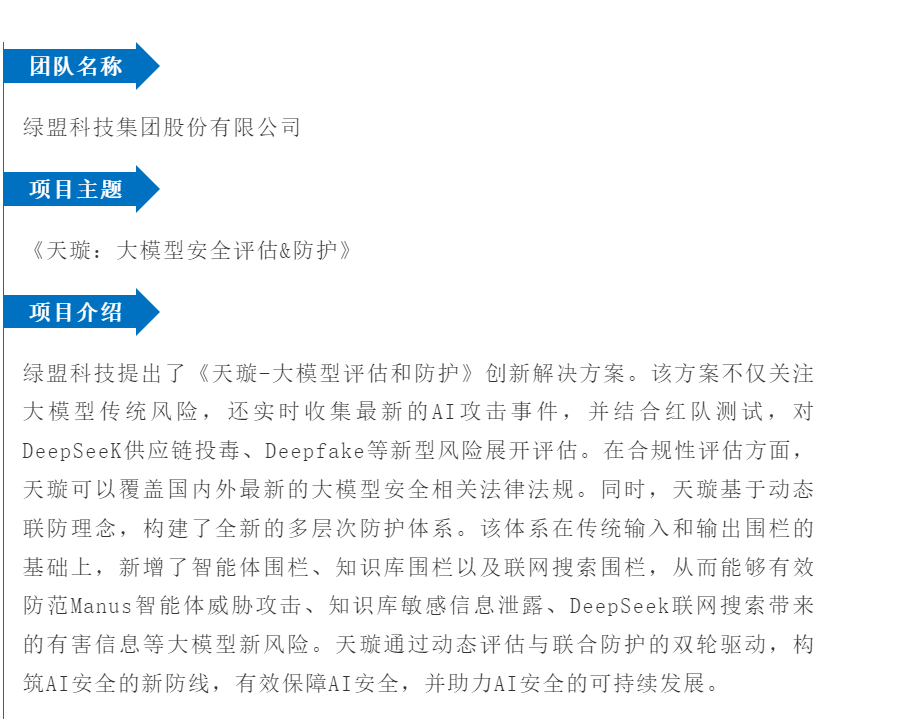 本次大赛旨在通过搭建开放的平台,集结各方力量,征集并遴选出一批原创型、引领型、有影响力的解决方案,推动AI安全领域的技术应用突破。在初赛的激烈竞争后,共有六支参赛队伍进入复赛,在复赛现场进行项目展示与答辩,经过评委组专家的现场打分,角逐出三个优秀作品获得了决赛资格。
